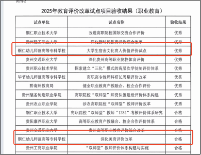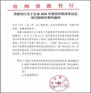 近日,贵州省教育厅公布了“教育评价改革试点项目”验收评定结果。我校组织申报并实施的两个试点项目全部顺利通过验收,并取得了“一”优秀、“一”合格的优秀成绩,充分体现了我校在深化新时代教育评价改革方面的积极探索与扎实成效。