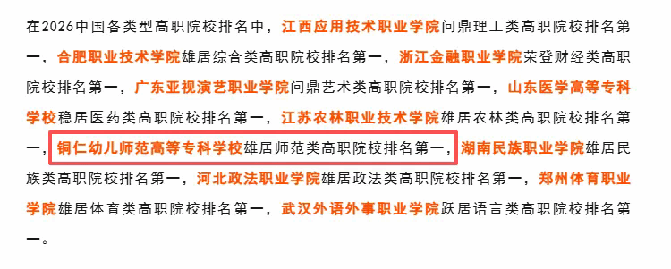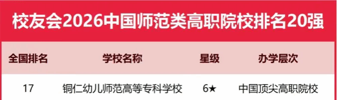 近日,全国第三方大学评价研究机构艾瑞深校友会网正式发布《2026校友会中国大学排名》。最新榜单显示,我校再度位列全国师范类高职院校榜首。这是我校自2021年起,连续六年在该权威榜单中蝉联师范类高职院校冠军,持续领跑全国同类院校。