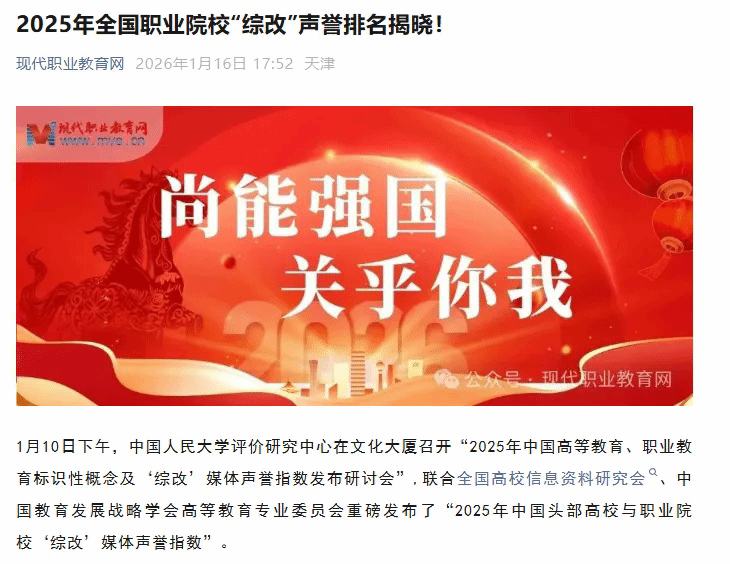 近日,中国人民大学评价研究中心联合全国高校信息资料研究会、中国教育发展战略学会高等教育专业委员会等多家权威机构发布了“2025年中国职业院校‘综改’媒体声誉指数”。该评价体系首次完全以主流媒体及社会化媒体平台的公开新闻报道为数据来源,对全国职业院校的综合改革动态与社会声誉进行量化评估。我校获高职院校“综改”提名学校,从第三方视角充分肯定了我校宣传思想工作围绕中心、服务大局所取得的显著成效。